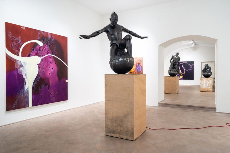 Im Vordergrund mögen, mit schillernden weißen Pinselstrichen, minimalistische Portraits den ersten Blick einfangen; mögen teils pastos aufgetragene (vielleicht gegenstandslose) Linien, Augen, Zähne, Hundeköpfe dominieren. Oder Schuhe, die wie zu einem Lauf in die Tiefe positioniert sind.